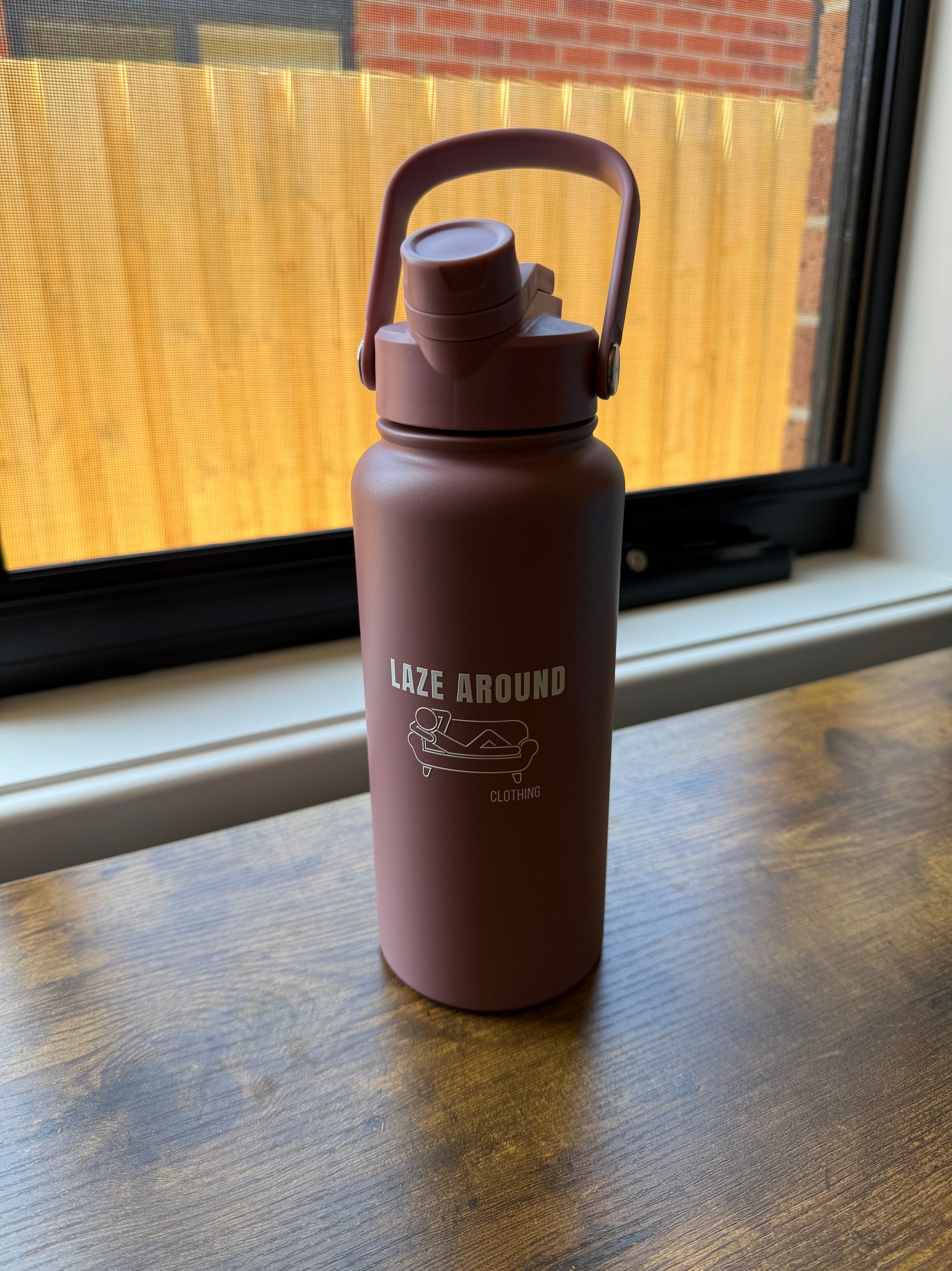 Our 32oz (946ml) insulated stainless steel drink bottles Feature the Laze Around logo, stunning colour choices, and a versatile lid with a straw on one side and an open mouthpiece on the other. Hydration made easy, stylish, and functional!